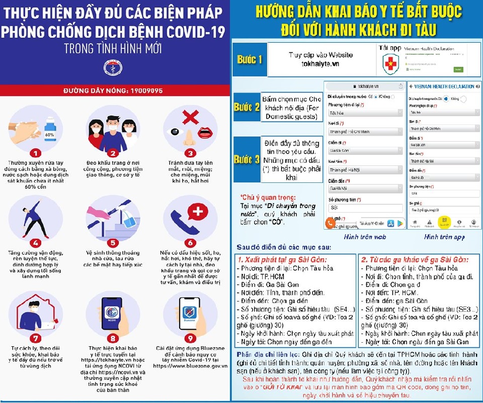 Để đảm bảo an toàn cho bản thân và cộng đồng, ĐSVN khuyến cáo hành khách thực hiện khai báo y tế trước khi lên tàu, kiểm tra thân nhiệt tại các ga, thường xuyên rửa tay bằng dung dịch hoặc xà phòng sát khuẩn (được trang bị tại nhà ga và trên tàu), đeo khẩu trang khi ra ga và lên tàu và hạn chế đi lại giữa các toa xe nếu không thực sự cần thiết…