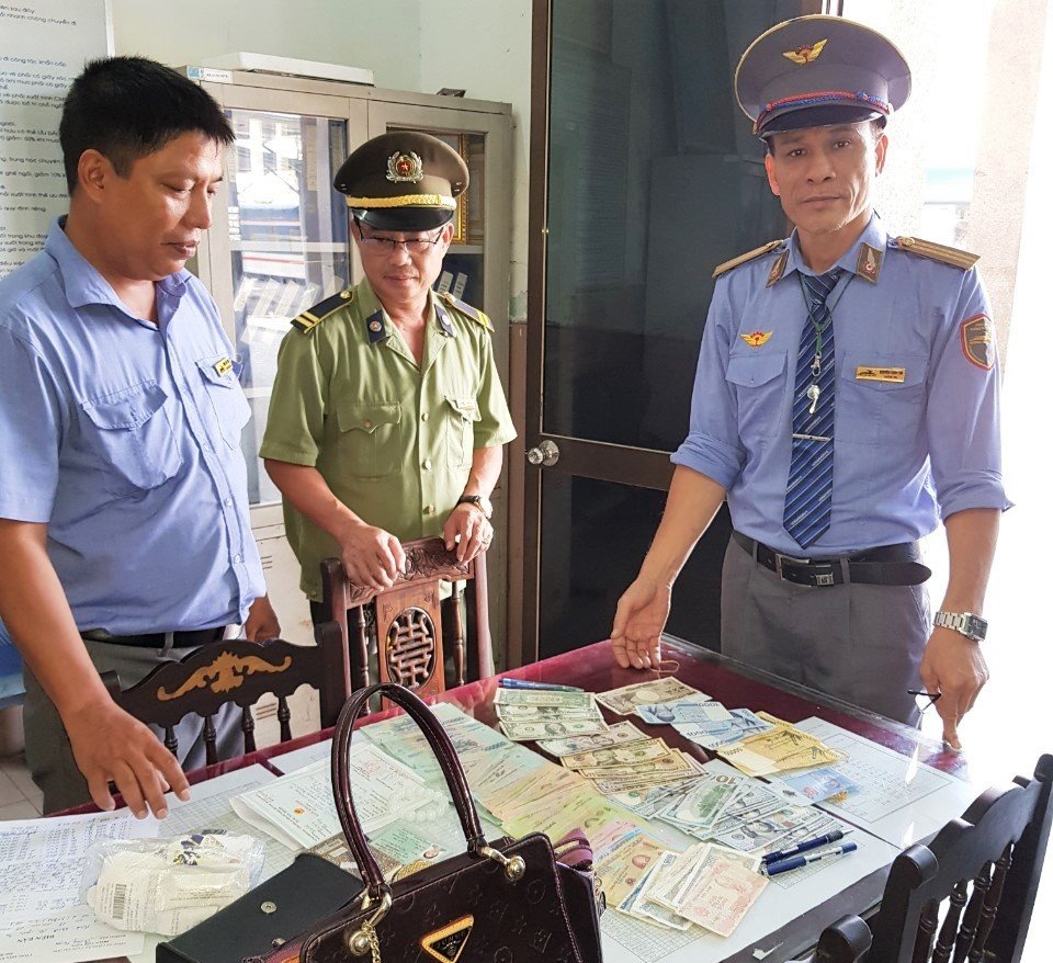 Khi tiến hành kiểm tra bên trong túi xách gồm có một số giấy tờ tuỳ thân, hơn 34 triệu đồng, 1.184 USD, 10.000 YEN, 154.000 WON, 1 vòng đeo tay màu trắng bằng đá và một số vật dụng cá nhân khác.