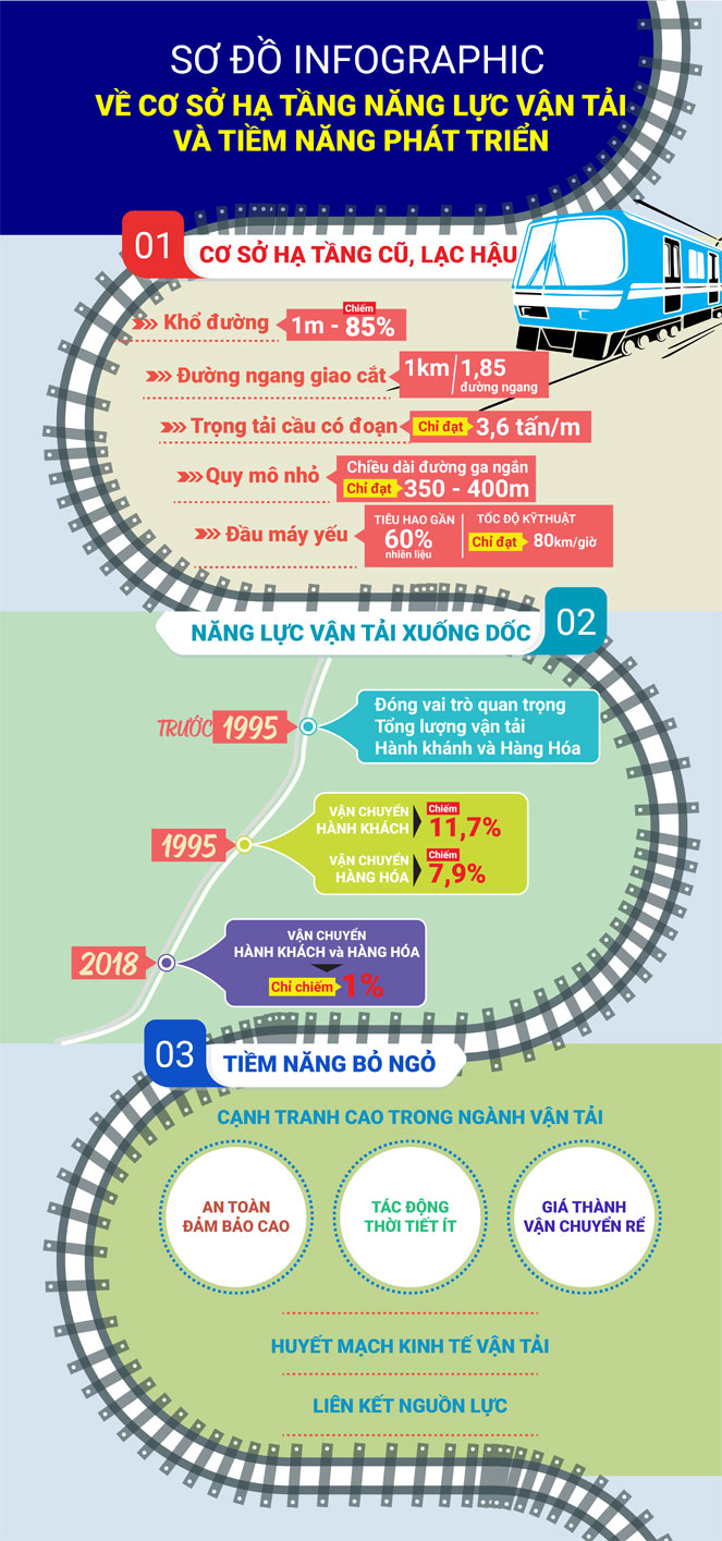 Bên cạnh đó, ngành đường sắt vẫn vận hành trên hệ thống khổ đường 1m, chiếm 85% hệ thống đường sắt cả nước. Trong khi toàn tuyến 297 ga nhưng phần lớn quy mô nhỏ, hạ tầng cũ. Điều này dẫn đến tình trạng thị phần vận tải của ngành đường sắt đã giảm đến mức đáng báo động.