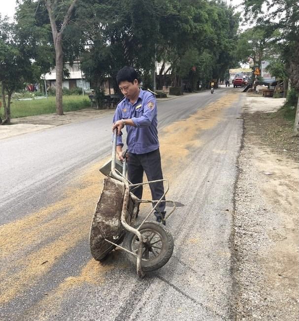 Xác định được tính chất nguy hiểm từ những vết dầu loang đó nên ngay lập tức anh Kiên đã chạy đến nhà dân xin cát và mượn xe rùa để chở cát rải phủ ngay lên dầu. Nhiều người tham gia giao thông rất cảm kích trước hành động đẹp, việc làm kịp thời của anh Kiên.