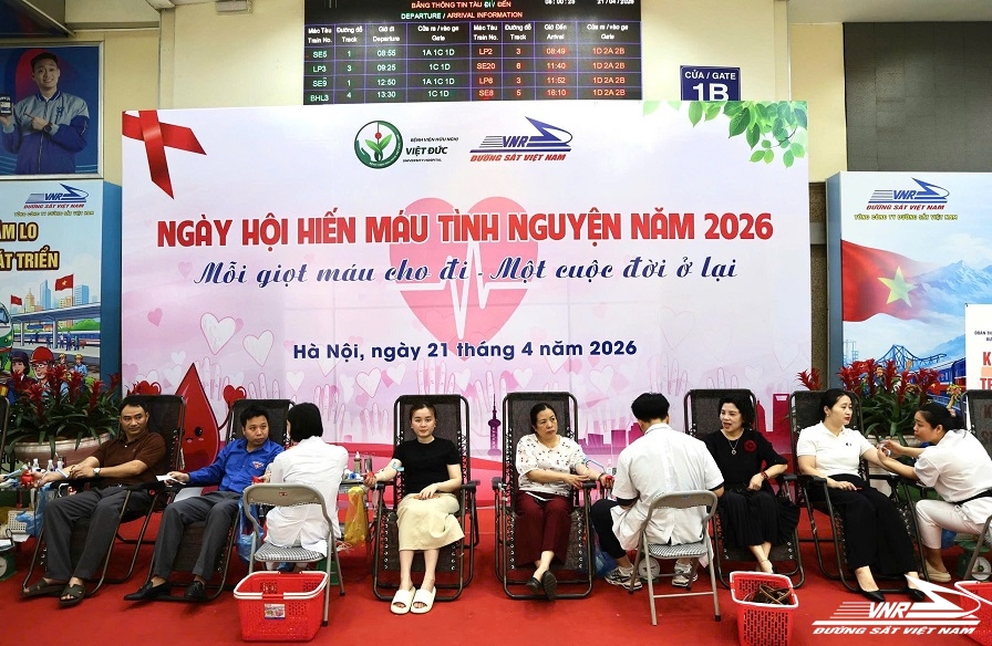 Sáng 21/4, tại Ga Hà Nội, Đoàn Thanh niên Tổng công ty Đường sắt Việt Nam kết hợp với Bệnh viện Việt Đức tổ chức hoạt động Hiến máu tình nguyện năm 2026 hướng đến chào mừng kỷ niệm 145 năm Đường sắt Việt Nam (1881 - 2026) 80 năm Ngày truyền thống ngành Đường sắt (21/10/1946 - 21/10/2026). Đây là hoạt động thường niên nhằm khơi dậy tinh thần tương thân tương ái của đội ngũ cán bộ, công nhân, lao động (CNLĐ) trong ngành Đường sắt và tinh thần tình nguyện tuổi trẻ.