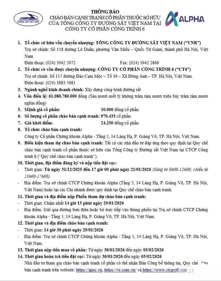Thông báo chào bán cạnh tranh cổ phần thuộc sở hữu của Tổng công ty ĐSVN tại Công ty CP Công trình 6, cụ thể: