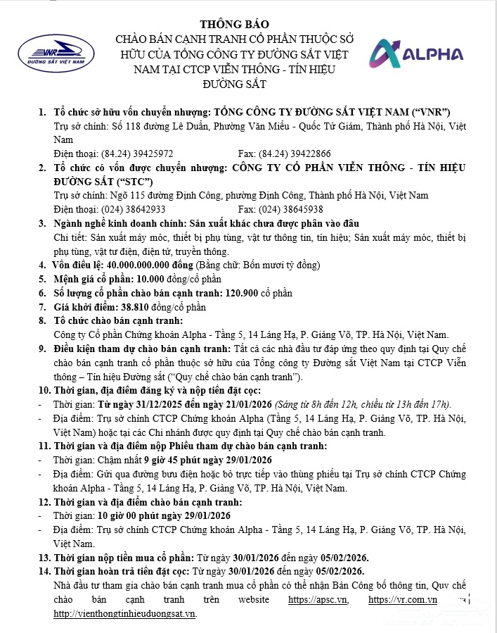 Thông báo chào bán cạnh tranh cổ phần thuộc sở hữu của Tổng công ty ĐSVN tại Công ty CP Viễn thông - Tín hiệu Đường sắt. Cụ thể: