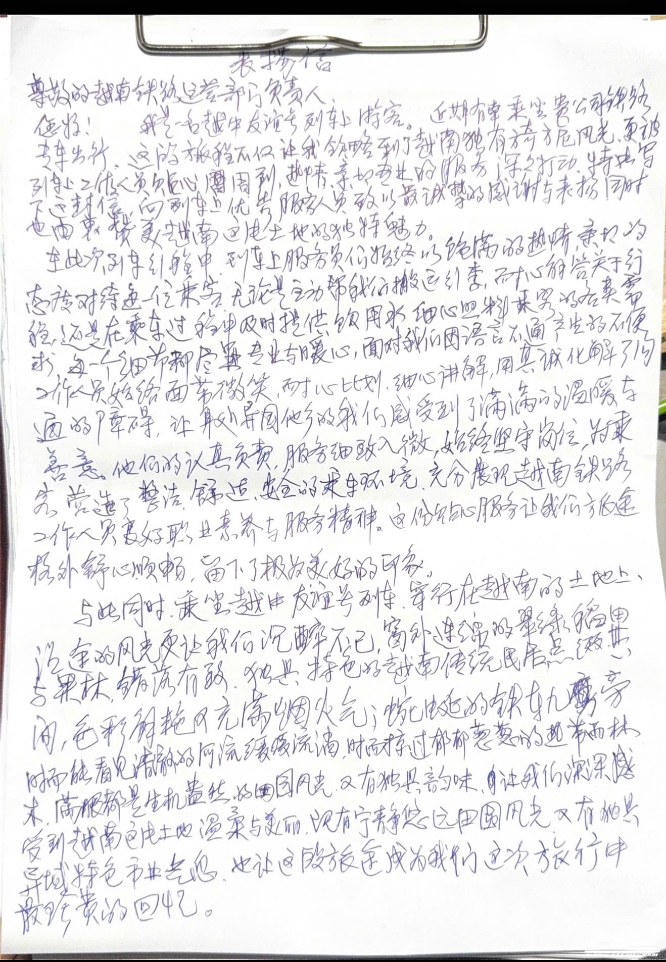 Chào các bạn! Tôi là một hành khách Trung Quốc đi trên chuyến tàu Hữu nghị Trung - Việt. Thật may mắn khi được trải nghiệm chuyến tàu của quý công ty. Hành trình này không chỉ giúp tôi thưởng ngoạn phong cảnh độc đáo của Việt Nam mà còn khiến tôi thực sự cảm động trước sự phục vụ tận tâm, chu đáo và nhiệt tình của đội ngũ nhân viên. Tôi viết thư này để bày tỏ lòng biết ơn chân thành nhất tới toàn thể nhân viên phục vụ trên chuyến tàu, đồng thời ca ngợi sức hấp dẫn đặc biệt của mảnh đất Việt Nam.