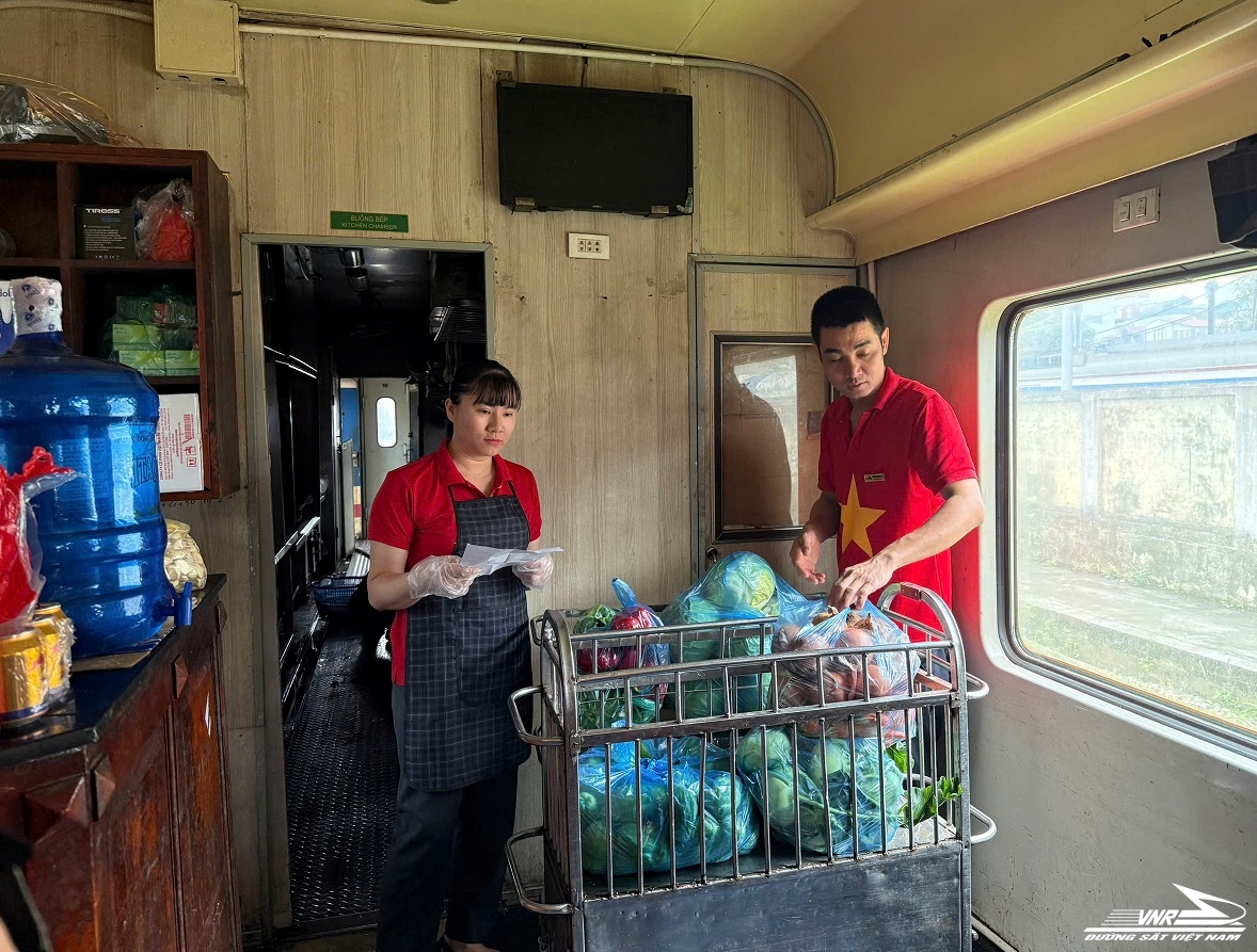 Trên mỗi chuyến tàu, tổ phục vụ bố trí đầy đủ 3 bữa ăn mỗi ngày. Bữa sáng gồm các món quen thuộc như phở, miến, cháo, bánh mì, bữa trưa và bữa tối là các bữa cơm đầy đủ món mặn, rau, canh, kèm hoa quả tráng miệng, giữa buổi hoặc ban đêm , hành khách có thể lựa chọn các món ăn nhẹ nhàng như bánh bao, mì ly, trái cây...